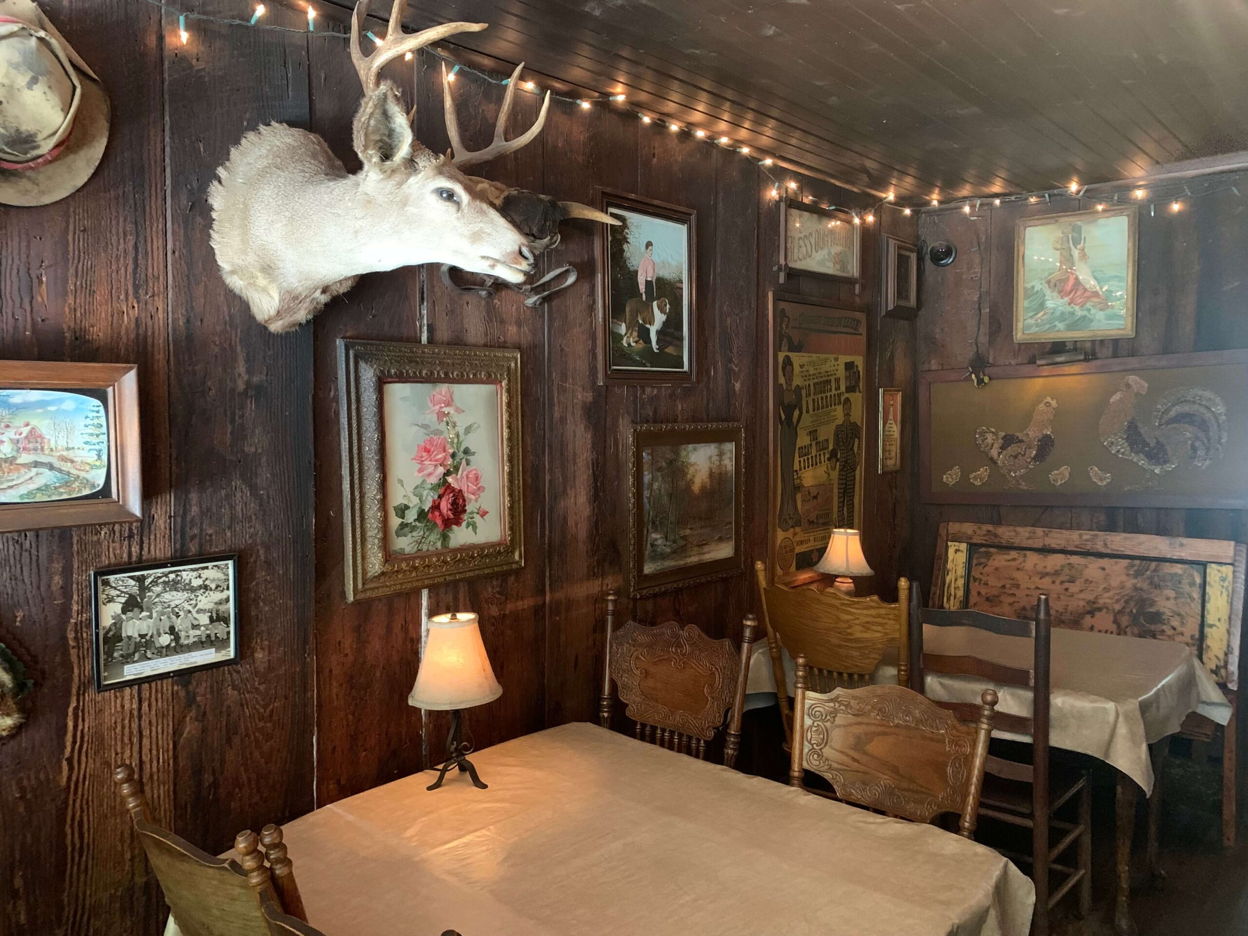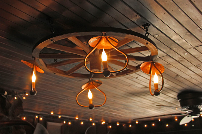 The buggy wheel light in the Long Room came from Tony’s Log Cabin.