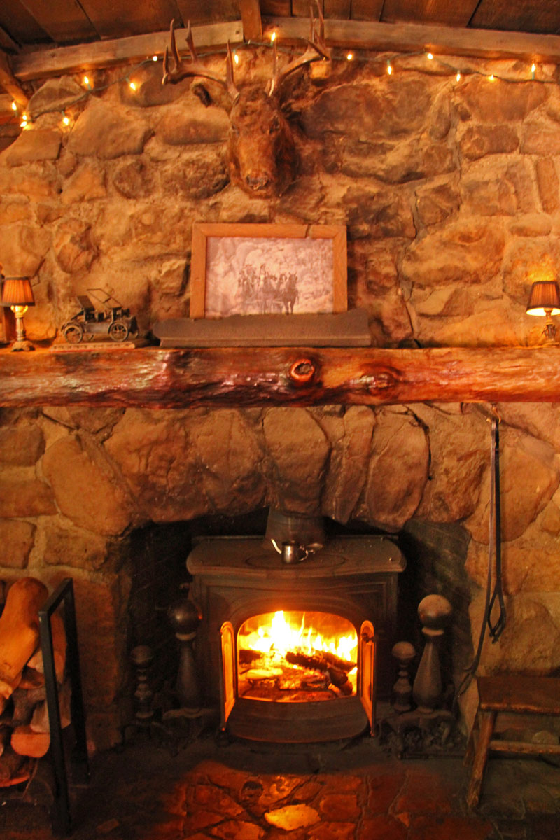 The mantel over the Log Cabin Bar fireplace, built in 1955, is made from the last Edison electric pole used in the area.